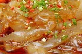3.湯泡沙河粉,將沙河粉100克放在笊籬內(nèi),置沸水中燙熱,倒在碗內(nèi),加鮮湯、熟菜心、熟魚片或其他熟肉料,調(diào)味即成。