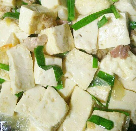 5、放入焯好水的豆腐輕輕翻炒均勻,調(diào)少許鹽,加水淀粉勾薄芡,撒蔥花即可出鍋。